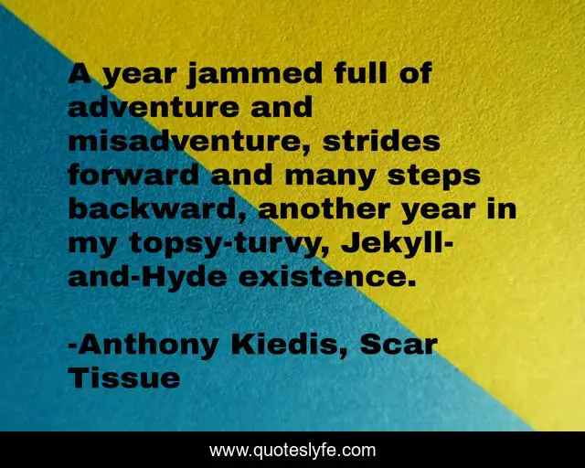 This page presents the quote "A year jammed full of adventure and misadventure, strides forward and many steps backward, another year in my topsy-turvy, Jekyll-and-Hyde existence.". Author of this quote is Anthony Kiedis, Scar Tissue. This quote is about jekyll, hyde, adventure, misadventure,.