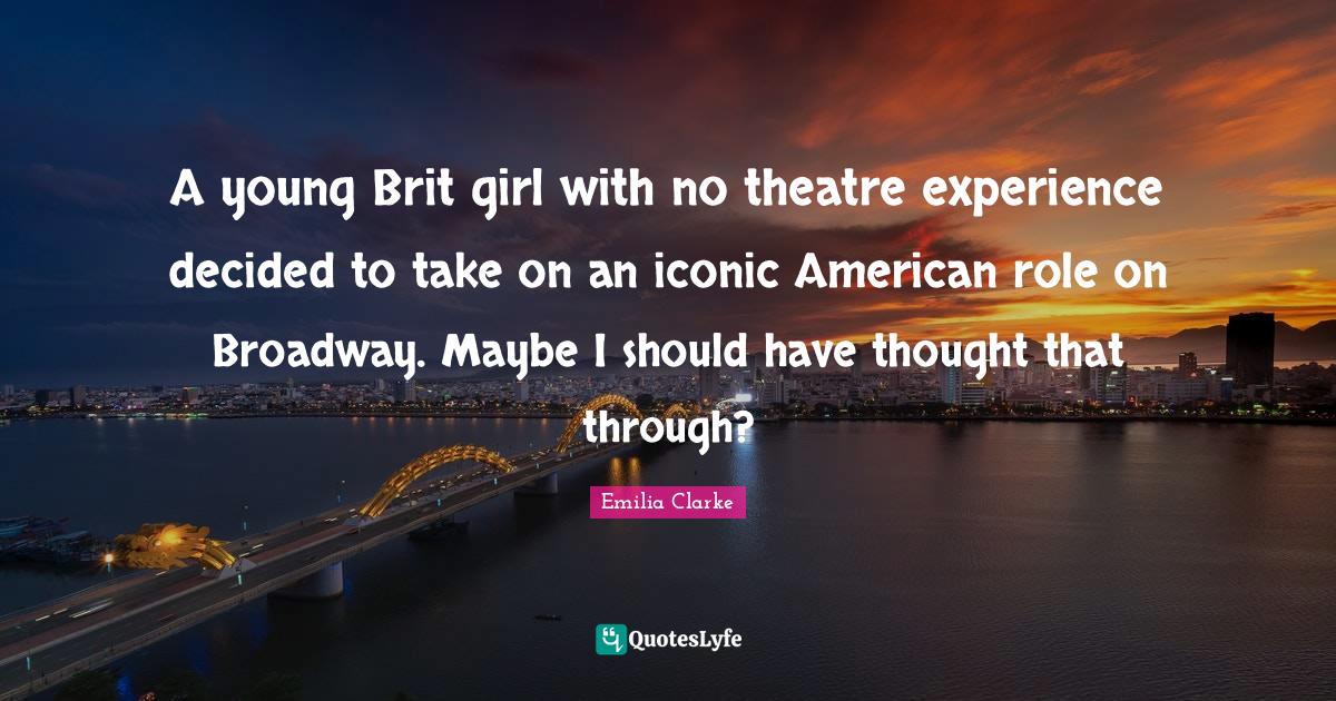 This page presents the quote "A young Brit girl with no theatre experience decided to take on an iconic American role on Broadway. Maybe I should have thought that through?". Author of this quote is Emilia Clarke. This quote is about decided, theatre, broadway, girl, young, iconic, should have, experience,.