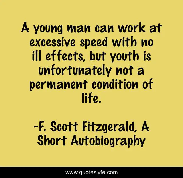 This page presents the quote "A young man can work at excessive speed with no ill effects, but youth is unfortunately not a permanent condition of life.". Author of this quote is F. Scott Fitzgerald, A Short Autobiography. This quote is about youth, life,.
