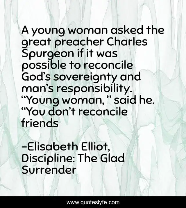 This page presents the quote "A young woman asked the great preacher Charles Spurgeon if it was possible to reconcile God’s sovereignty and man’s responsibility. “Young woman, ” said he. “You don’t reconcile friends". Author of this quote is Elisabeth Elliot, Discipline: The Glad Surrender. This quote is about responsibility, charles-spurgeon, christianity,.