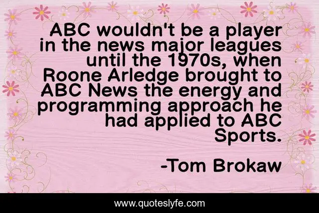 This page presents the quote "ABC wouldn't be a player in the news major leagues until the 1970s, when Roone Arledge brought to ABC News the energy and programming approach he had applied to ABC Sports.". Author of this quote is Tom Brokaw. This quote is about news, energy, programming,.