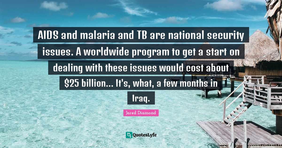 This page presents the quote "AIDS and malaria and TB are national security issues. A worldwide program to get a start on dealing with these issues would cost about $25 billion... It's, what, a few months in Iraq.". Author of this quote is Jared Diamond. This quote is about program, months, national security, aids, cost, malaria, iraq, issues,.