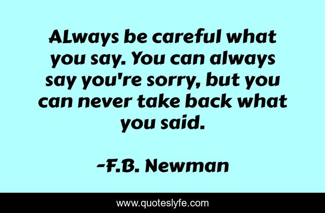 This page presents the quote "ALways be careful what you say. You can always say you're sorry, but you can never take back what you said.". Author of this quote is F.B. Newman. This quote is about speaking-your-mind, philosophy-of-life, kindness,.