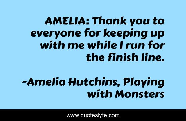 This page presents the quote "AMELIA: Thank you to everyone for keeping up with me while I run for the finish line.". Author of this quote is Amelia Hutchins, Playing with Monsters. This quote is about dedication, friendship,.