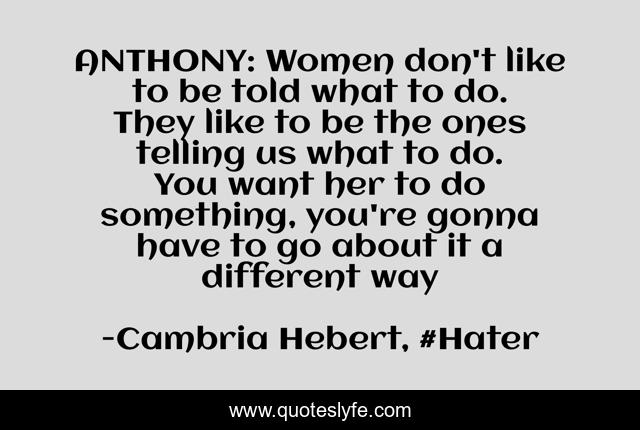 This page presents the quote "ANTHONY: Women don't like to be told what to do. They like to be the ones telling us what to do. You want her to do something, you're gonna have to go about it a different way". Author of this quote is Cambria Hebert, #Hater. This quote is about relationships, adult-romance, women,.