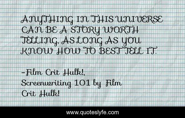 This page presents the quote "ANYTHING IN THIS UNIVERSE CAN BE A STORY WORTH TELLING, AS LONG AS YOU KNOW HOW TO BEST TELL IT.". Author of this quote is Film Crit Hulk!, Screenwriting 101 by Film Crit Hulk!. This quote is about art, stories, film, storytelling,.