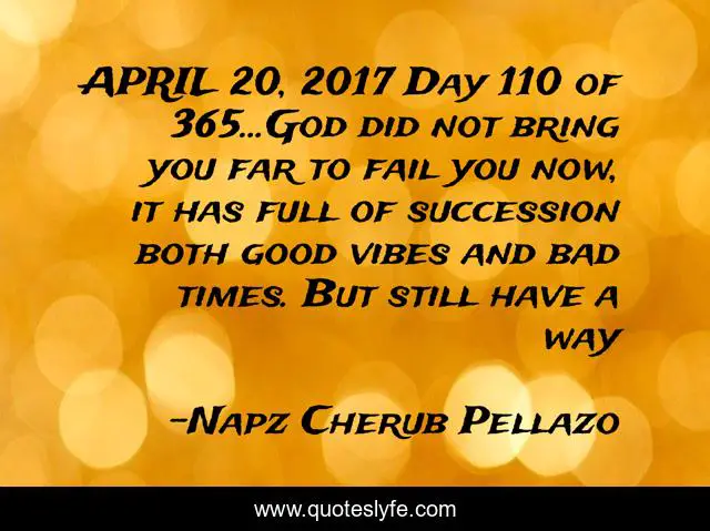 This page presents the quote "APRIL 20, 2017 Day 110 of 365...God did not bring you far to fail you now, it has full of succession both good vibes and bad times. But still have a way". Author of this quote is Napz Cherub Pellazo. This quote is about badtimes, positivity, april, goodtimes, herbs, healing, inspirational, 420, enthusiasm,.