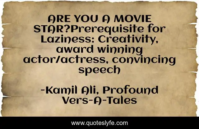 This page presents the quote "ARE YOU A MOVIE STAR?Prerequisite for Laziness: Creativity, award winning actor/actress, convincing speech". Author of this quote is Kamil Ali, Profound Vers-A-Tales. This quote is about kamiltheauthor, laziness, profound, movie, philosophy, creativity, actress, speech, actor,.