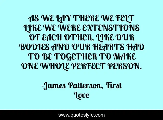 This page presents the quote "AS WE LAY THERE WE FELT LIKE WE WERE EXTENSTIONS OF EACH OTHER, LIKE OUR BODIES AND OUR HEARTS HAD TO BE TOGETHER TO MAKE ONE WHOLE PERFECT PERSON.". Author of this quote is James Patterson, First Love. This quote is about love, eachother, two-hearts-one-soul, extensions, perfection, affection,.