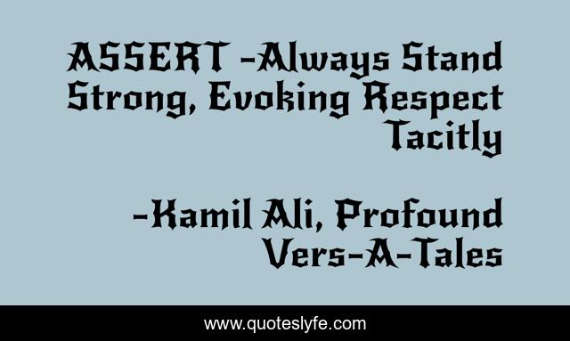 This page presents the quote "ASSERT -Always Stand Strong, Evoking Respect Tacitly". Author of this quote is Kamil Ali, Profound Vers-A-Tales. This quote is about kamiltheauthor, vers, kamil, ali, tales, philosophy, tacit, assert, evoke,.