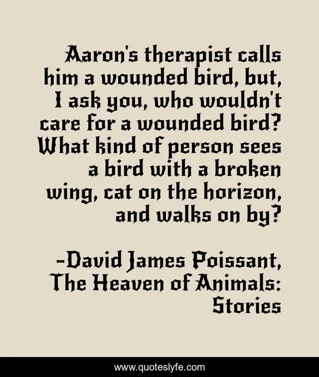 This page presents the quote "Aaron's therapist calls him a wounded bird, but, I ask you, who wouldn't care for a wounded bird? What kind of person sees a bird with a broken wing, cat on the horizon, and walks on by?". Author of this quote is David James Poissant, The Heaven of Animals: Stories. This quote is about therapist, help,.