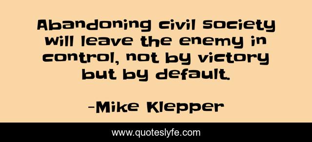 This page presents the quote "Abandoning civil society will leave the enemy in control, not by victory but by default.". Author of this quote is Mike Klepper. This quote is about neglect, abandonment, civil-society, victory,.