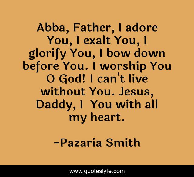 This page presents the quote "Abba, Father, I adore You, I exalt You, I glorify You, I bow down before You. I worship You O God! I can't live without You. Jesus, Daddy, I ❤ You with all my heart.". Author of this quote is Pazaria Smith. This quote is about god, father, worship, prayer,.