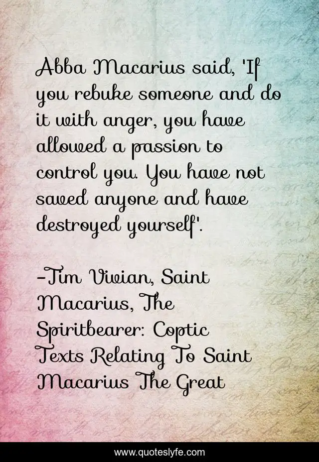 This page presents the quote "Abba Macarius said, 'If you rebuke someone and do it with anger, you have allowed a passion to control you. You have not saved anyone and have destroyed yourself'.". Author of this quote is Tim Vivian, Saint Macarius, The Spiritbearer: Coptic Texts Relating To Saint Macarius The Great. .