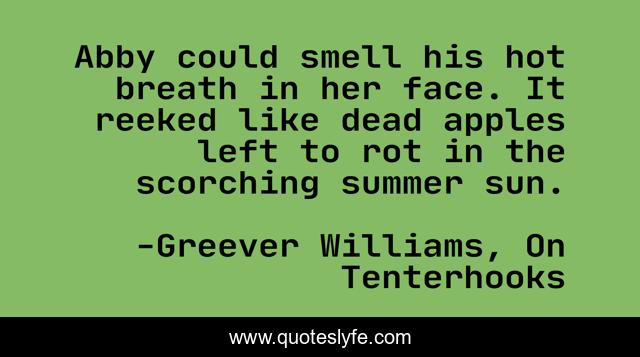 This page presents the quote "Abby could smell his hot breath in her face. It reeked like dead apples left to rot in the scorching summer sun.". Author of this quote is Greever Williams, On Tenterhooks. This quote is about death, murder, demon,.
