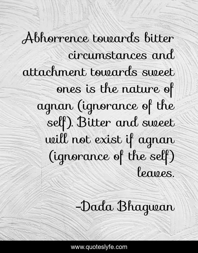 This page presents the quote "Abhorrence towards bitter circumstances and attachment towards sweet ones is the nature of agnan (ignorance of the self). Bitter and sweet will not exist if agnan (ignorance of the self) leaves.". Author of this quote is Dada Bhagwan. This quote is about spiritual, abhorrence, circumstance, self, ignorance, soul, attachment, bitter-circumstance, atma,.