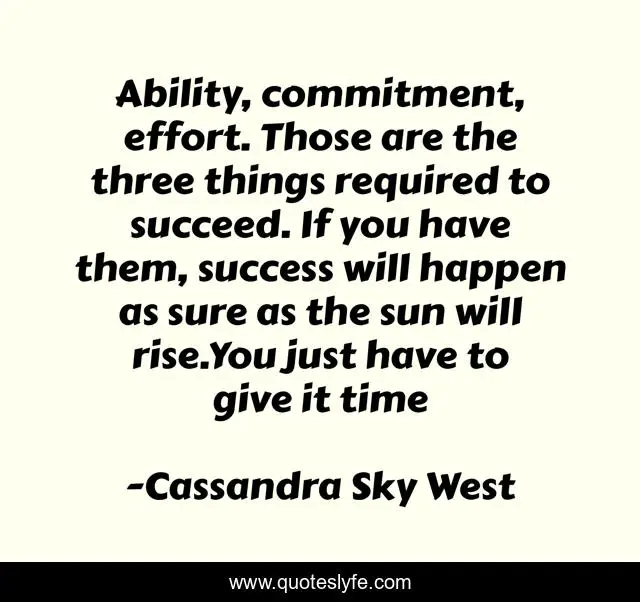 This page presents the quote "Ability, commitment, effort. Those are the three things required to succeed. If you have them, success will happen as sure as the sun will rise.You just have to give it time". Author of this quote is Cassandra Sky West. This quote is about enthusiasm, inspirational, success, writing,.