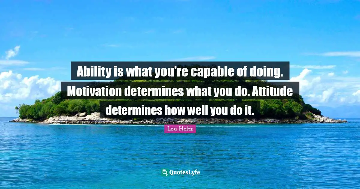 This page presents the quote "Ability is what you're capable of doing. Motivation determines what you do. Attitude determines how well you do it.". Author of this quote is Lou Holtz. This quote is about behaviour, attitude, football, motivation,.