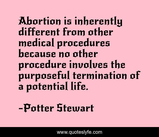 This page presents the quote "Abortion is inherently different from other medical procedures because no other procedure involves the purposeful termination of a potential life.". Author of this quote is Potter Stewart. This quote is about life, potential, abortion,.