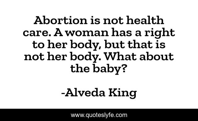 This page presents the quote "Abortion is not health care. A woman has a right to her body, but that is not her body. What about the baby?". Author of this quote is Alveda King. This quote is about baby, body, woman,.