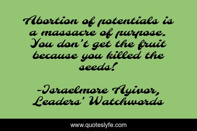 This page presents the quote "Abortion of potentials is a massacre of purpose. You don’t get the fruit because you killed the seeds!". Author of this quote is Israelmore Ayivor, Leaders' Watchwords. This quote is about food-for-thought, murder, purposeful, fruits, massacre, abortion, abort, kill, purpose,.