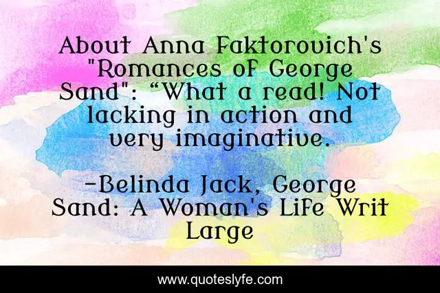 This page presents the quote "About Anna Faktorovich's "Romances of George Sand": “What a read! Not lacking in action and very imaginative.". Author of this quote is Belinda Jack, George Sand: A Woman's Life Writ Large. This quote is about george-sand, historical-fiction, blurb,.
