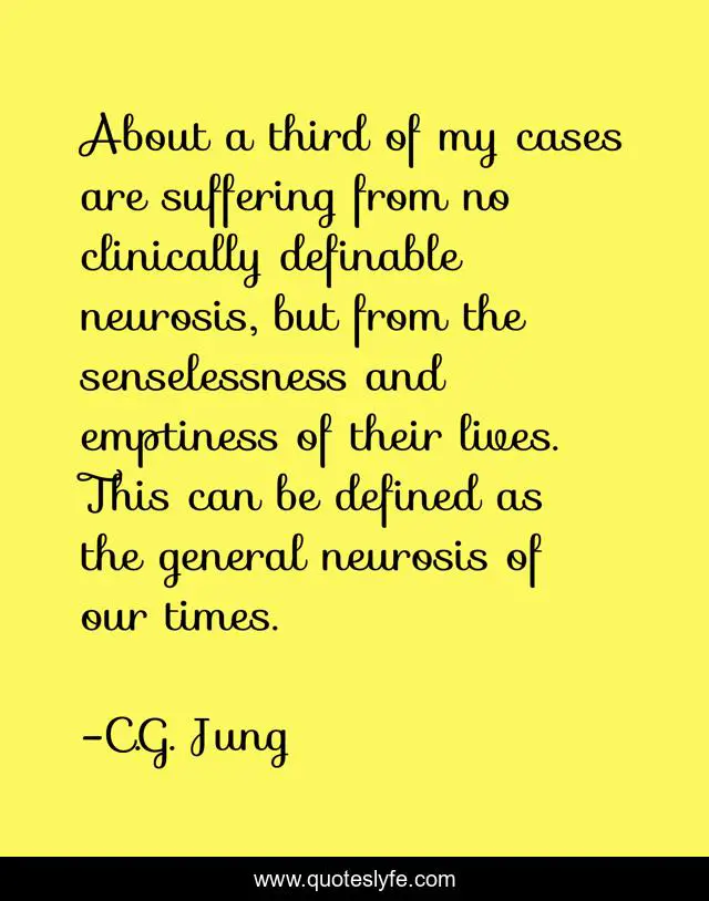 This page presents the quote "About a third of my cases are suffering from no clinically definable neurosis, but from the senselessness and emptiness of their lives. This can be defined as the general neurosis of our times.". Author of this quote is C.G. Jung. .