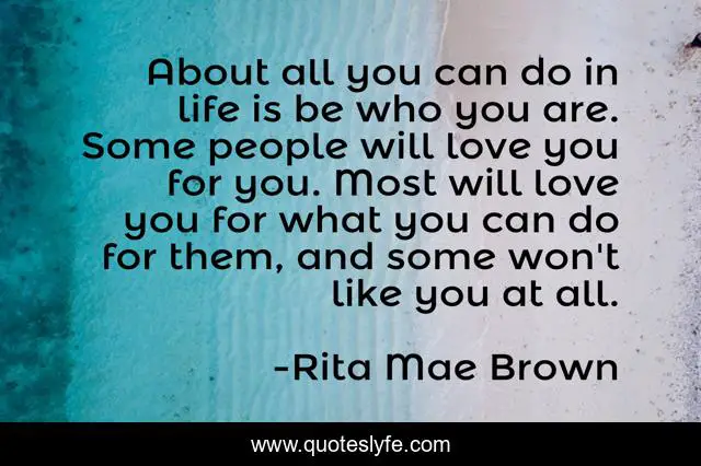 This page presents the quote "About all you can do in life is be who you are. Some people will love you for you. Most will love you for what you can do for them, and some won't like you at all.". Author of this quote is Rita Mae Brown. This quote is about be-yourself, individuality, love, affection,.