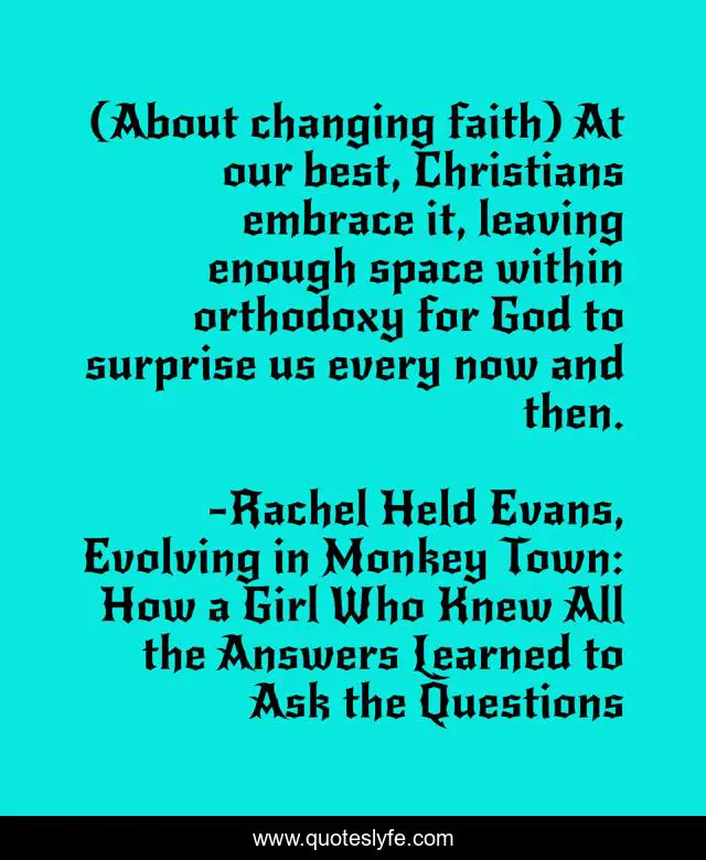 "Rachel Held Evans, Evolving in Monkey Town: How a Girl Who Knew All the Answers Learned to Ask the Questions Quotes." Quoteslyfe.com, 2025. Sat. 06 Dec. 2025. <https://www.quoteslyfe.com/quote/About-changing-faith-At-our-best-Christians-11354>.