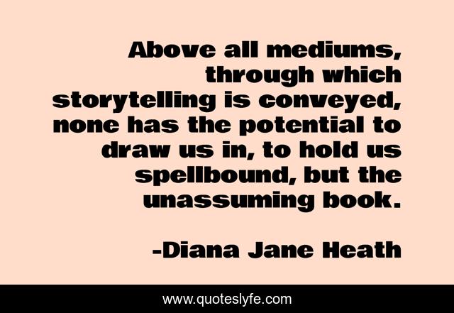 This page presents the quote "Above all mediums, through which storytelling is conveyed, none has the potential to draw us in, to hold us spellbound, but the unassuming book.". Author of this quote is Diana Jane Heath. This quote is about reading-books, writing-inspirational,.