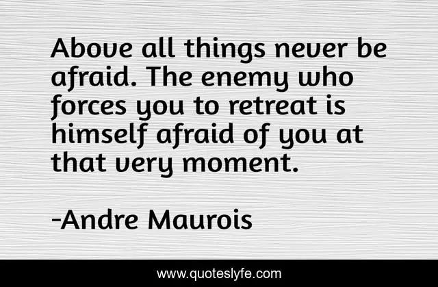 This page presents the quote "Above all things never be afraid. The enemy who forces you to retreat is himself afraid of you at that very moment.". Author of this quote is Andre Maurois. This quote is about success, happiness,.
