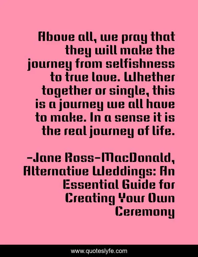 This page presents the quote "Above all, we pray that they will make the journey from selfishness to true love. Whether together or single, this is a journey we all have to make. In a sense it is the real journey of life.". Author of this quote is Jane Ross-MacDonald, Alternative Weddings: An Essential Guide for Creating Your Own Ceremony. This quote is about love, marriage, affection, prayer,.