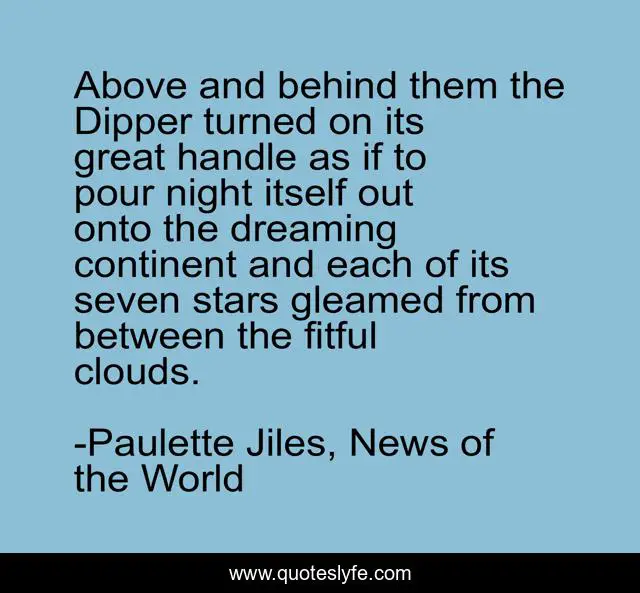 This page presents the quote "Above and behind them the Dipper turned on its great handle as if to pour night itself out onto the dreaming continent and each of its seven stars gleamed from between the fitful clouds.". Author of this quote is Paulette Jiles, News of the World. This quote is about astronomy, big-dipper, stars,.