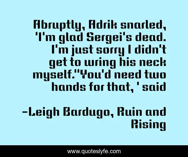 This page presents the quote "Abruptly, Adrik snarled, 'I'm glad Sergei's dead. I'm just sorry I didn't get to wring his neck myself.''You'd need two hands for that, ' said". Author of this quote is Leigh Bardugo, Ruin and Rising. .
