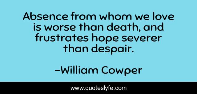 This page presents the quote "Absence from whom we love is worse than death, and frustrates hope severer than despair.". Author of this quote is William Cowper. This quote is about death, love, affection, sad,.