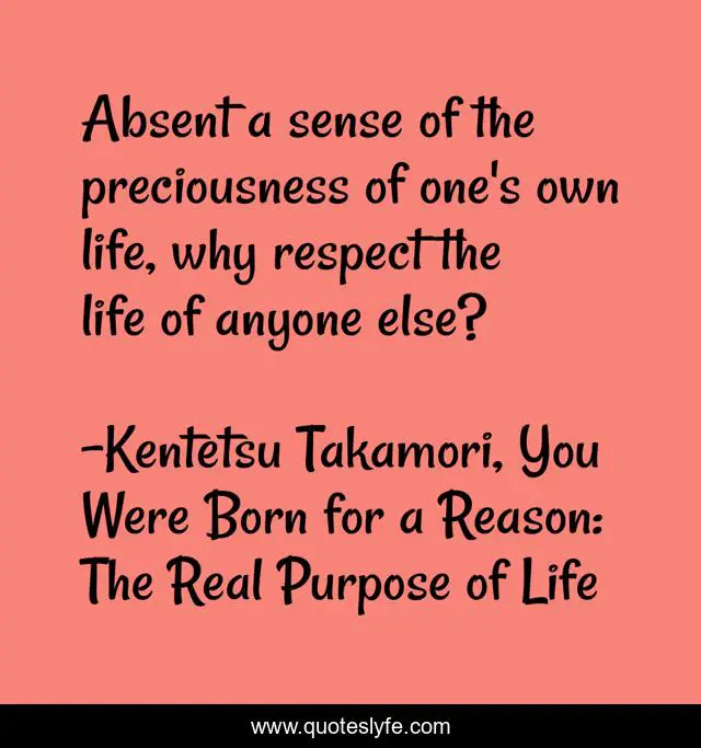This page presents the quote "Absent a sense of the preciousness of one's own life, why respect the life of anyone else?". Author of this quote is Kentetsu Takamori, You Were Born for a Reason: The Real Purpose of Life. This quote is about enthusiasm, buddhism, religious, inspirational, life-lessons,.
