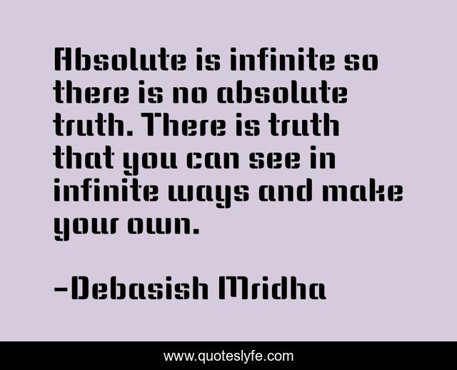 This page presents the quote "Absolute is infinite so there is no absolute truth. There is truth that you can see in infinite ways and make your own.". Author of this quote is Debasish Mridha. This quote is about inspirational, philosophy, debasish-mridha, how-to-see-the-truth, quotes, absolute-truth, truth, enthusiasm, debasish-mridha-md,.