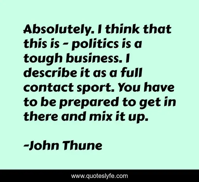 This page presents the quote "Absolutely. I think that this is - politics is a tough business. I describe it as a full contact sport. You have to be prepared to get in there and mix it up.". Author of this quote is John Thune. This quote is about politics, think, be prepared,.