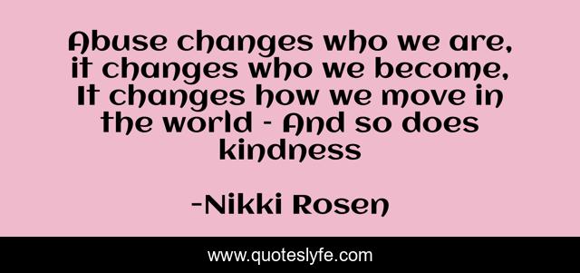 This page presents the quote "Abuse changes who we are, it changes who we become, It changes how we move in the world – And so does kindness". Author of this quote is Nikki Rosen. This quote is about world, kindness, changes, change,.