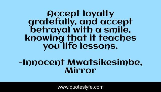 This page presents the quote "Accept loyalty gratefully, and accept betrayal with a smile, knowing that it teaches you life lessons.". Author of this quote is Innocent Mwatsikesimbe, Mirror. This quote is about life, betrayal, loyalty, self-improvement,.