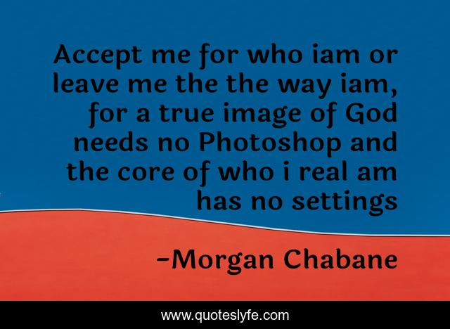 This page presents the quote "Accept me for who iam or leave me the the way iam, for a true image of God needs no Photoshop and the core of who i real am has no settings". Author of this quote is Morgan Chabane. This quote is about self-acceptance, self-love,.