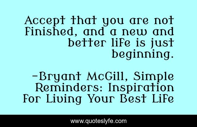 This page presents the quote "Accept that you are not finished, and a new and better life is just beginning.". Author of this quote is Bryant McGill, Simple Reminders: Inspiration for Living Your Best Life. This quote is about newness, beginings, acceptance, growth,.