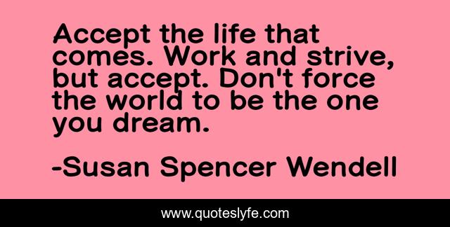 This page presents the quote "Accept the life that comes. Work and strive, but accept. Don't force the world to be the one you dream.". Author of this quote is Susan Spencer Wendell. .