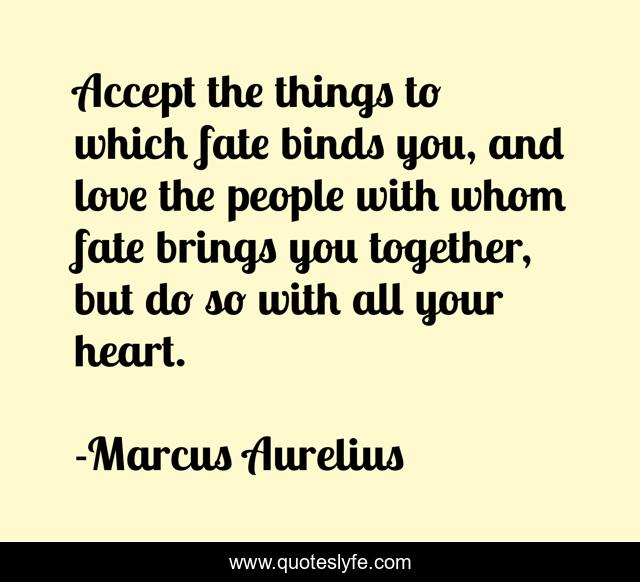 This page presents the quote "Accept the things to which fate binds you, and love the people with whom fate brings you together, but do so with all your heart.". Author of this quote is Marcus Aurelius. This quote is about heart, love, together, affection,.