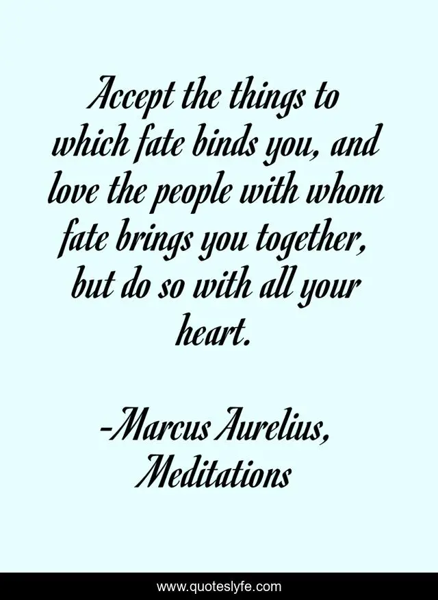 This page presents the quote "Accept the things to which fate binds you, and love the people with whom fate brings you together, but do so with all your heart.". Author of this quote is Marcus Aurelius, Meditations. This quote is about love, fate, affection, people,.