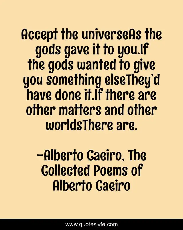 This page presents the quote "Accept the universeAs the gods gave it to you.If the gods wanted to give you something elseThey’d have done it.If there are other matters and other worldsThere are.". Author of this quote is Alberto Caeiro, The Collected Poems of Alberto Caeiro. This quote is about pantheism, acceptance, love, beauty, nature, god, peace, universe, it-is-what-it-is,.