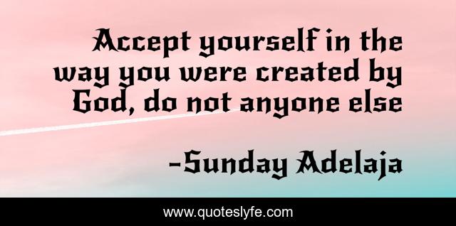 This page presents the quote "Accept yourself in the way you were created by God, do not anyone else". Author of this quote is Sunday Adelaja. This quote is about self-acceptance, life, creation, people, god,.
