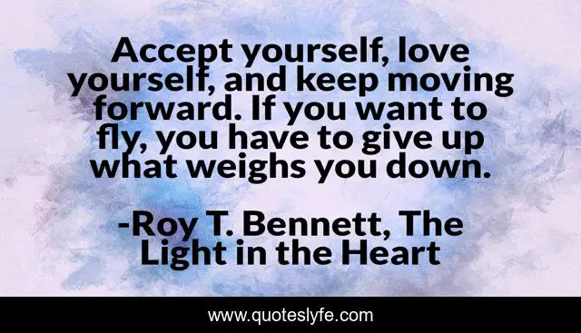 This page presents the quote "Accept yourself, love yourself, and keep moving forward. If you want to fly, you have to give up what weighs you down.". Author of this quote is Roy T. Bennett, The Light in the Heart. This quote is about inspire, optimistic, inspirational-life, life-and-living, living, inspiring, letting-go, positive, positive-thinking,.