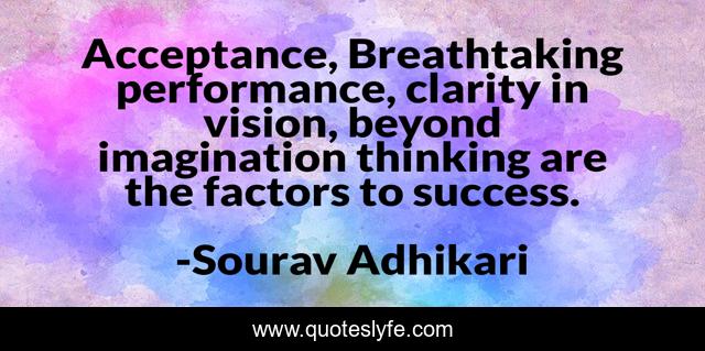 This page presents the quote "Acceptance, Breathtaking performance, clarity in vision, beyond imagination thinking are the factors to success.". Author of this quote is Sourav Adhikari. This quote is about sourav, success,.