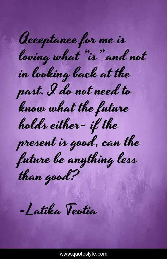 This page presents the quote "Acceptance for me is loving what “is” and not in looking back at the past. I do not need to know what the future holds either- if the present is good, can the future be anything less than good?". Author of this quote is Latika Teotia. This quote is about wellness, acceptance, love, affection,.